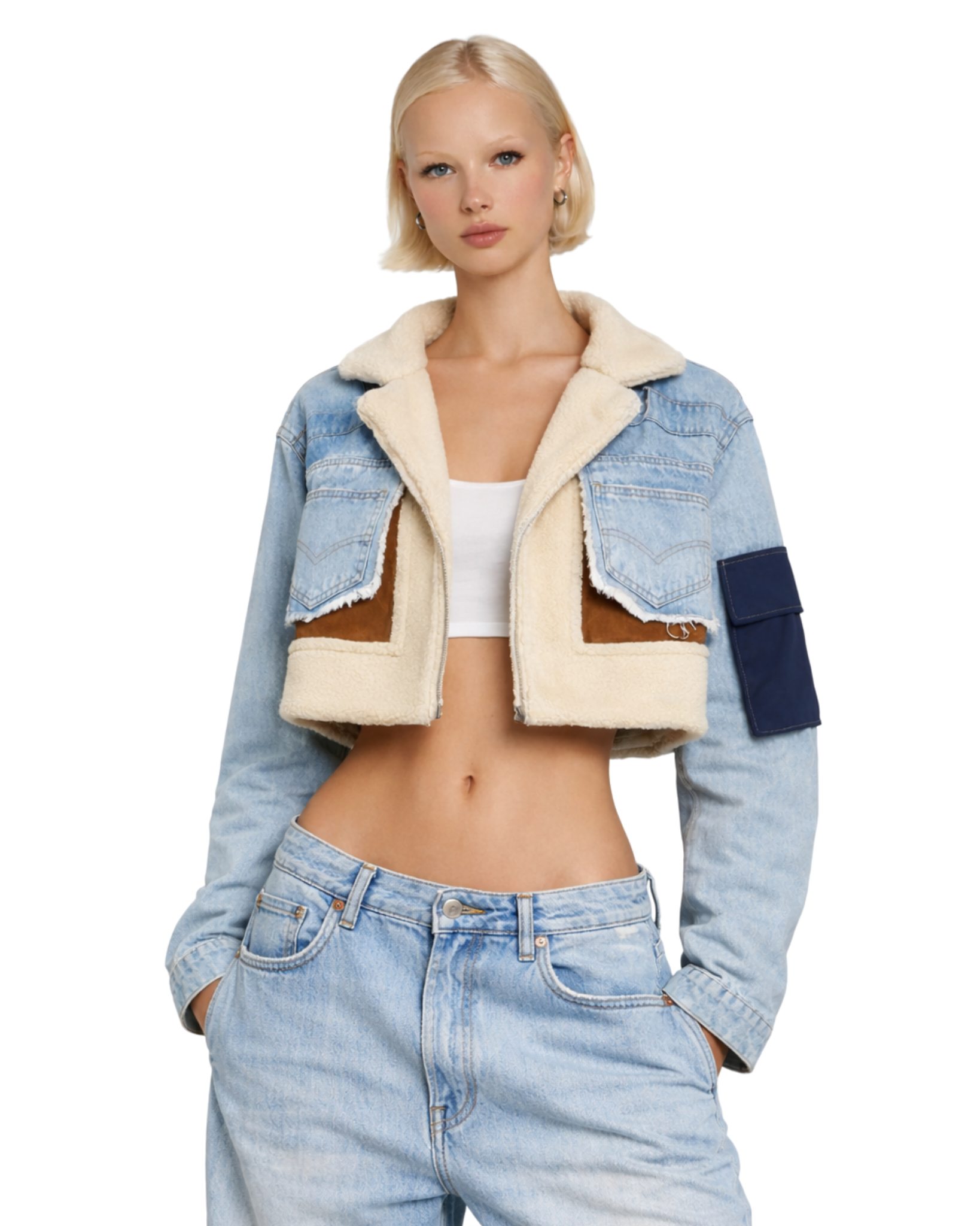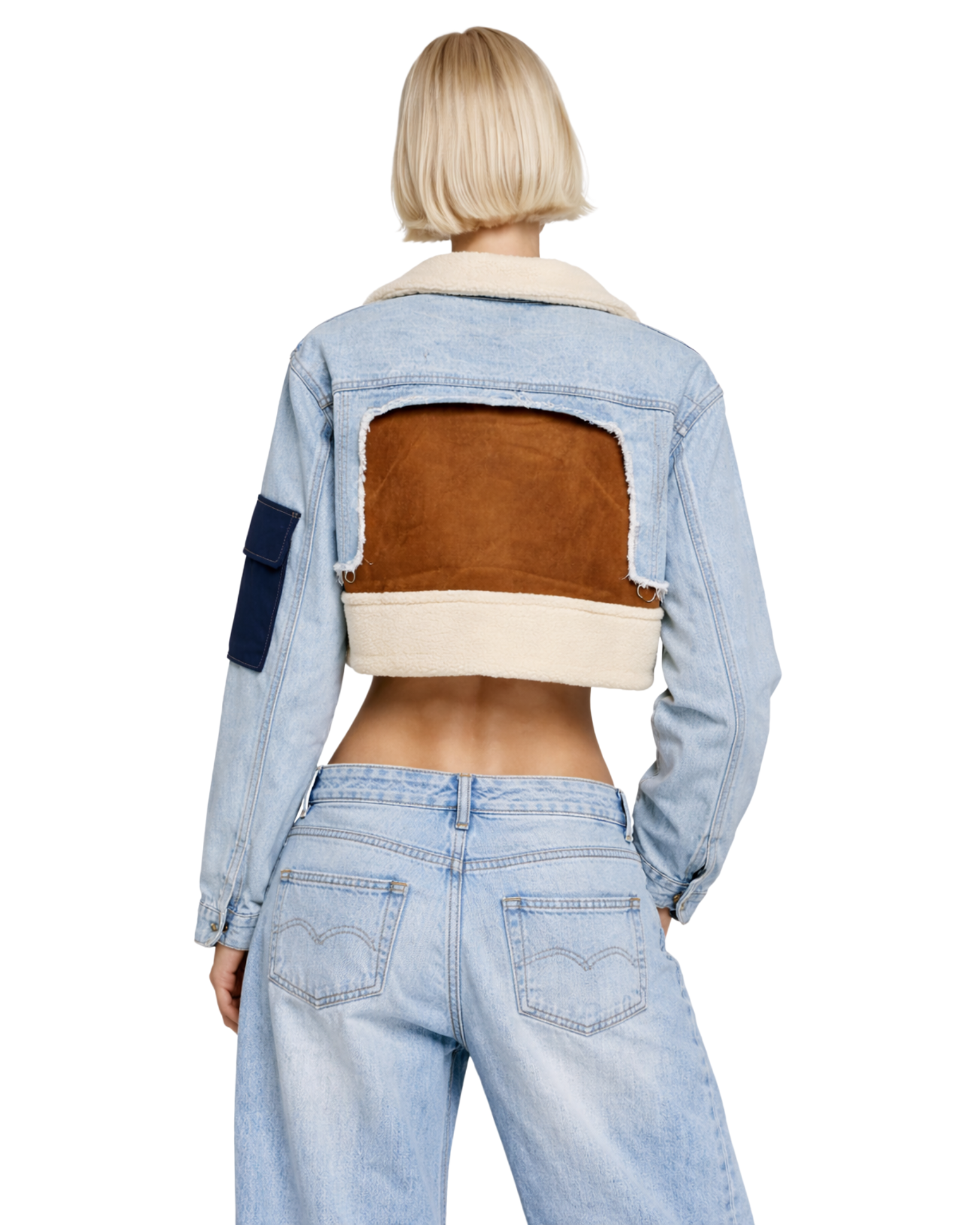 This patchwork jacket is a unique and stylish addition to any wardrobe. It is made from a combination of denim, soft faux suede, and faux fur lining, creating a textured and interesting look. The jacket features a patchwork design that gives it a fun and eclectic feel. The front pockets add practicality and convenience to the jacket.