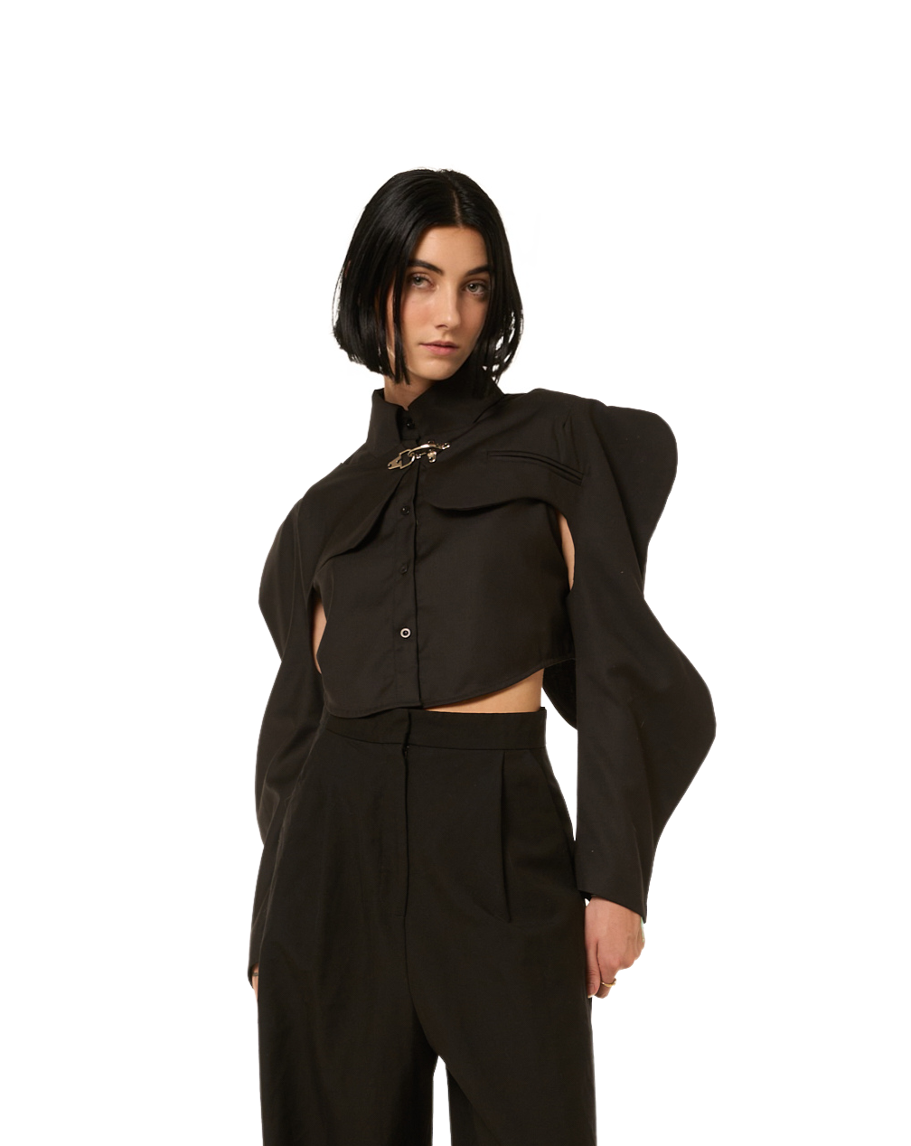 This top features a classic shirt neck and separated sleeves that give the top a modern and contemporary feel, making it perfect for those who want to make a statement with their fashion choices. The sleeves have a wave design and a metal embellishment that can be opened and closed, adding an interesting and unexpected element. The top is made of high-quality materials that ensure it will last for years to come.