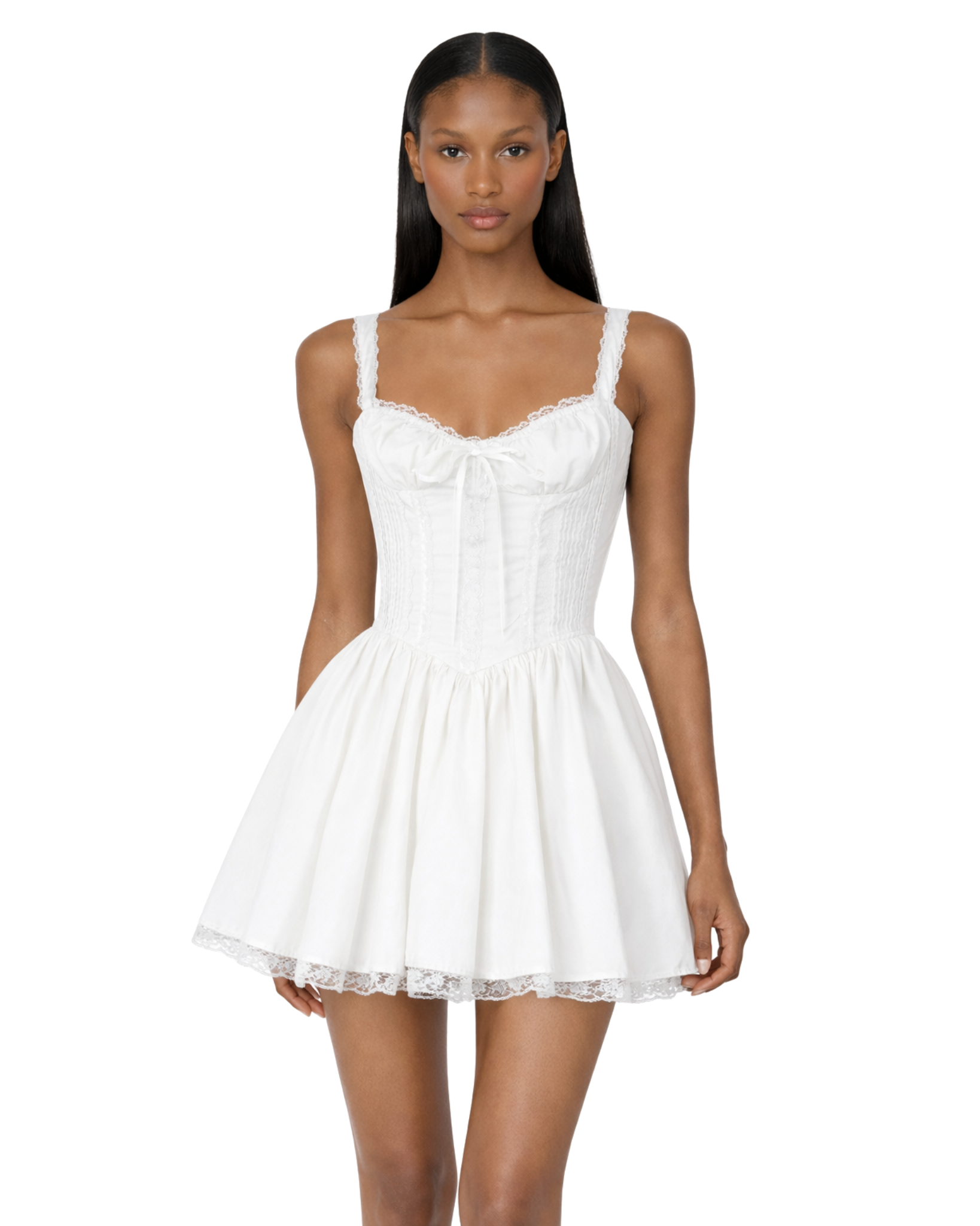 This dress features a stunning corset lace on the back, allowing you to tailor the fit to perfection, sculpting a beautiful silhouette. Delicate lace and ruffled details adorn both the skirt and top, adding a touch of romance to every movement. Comes with a hidden zipper on the back so you don't have to open the lace every time you want to wear it.