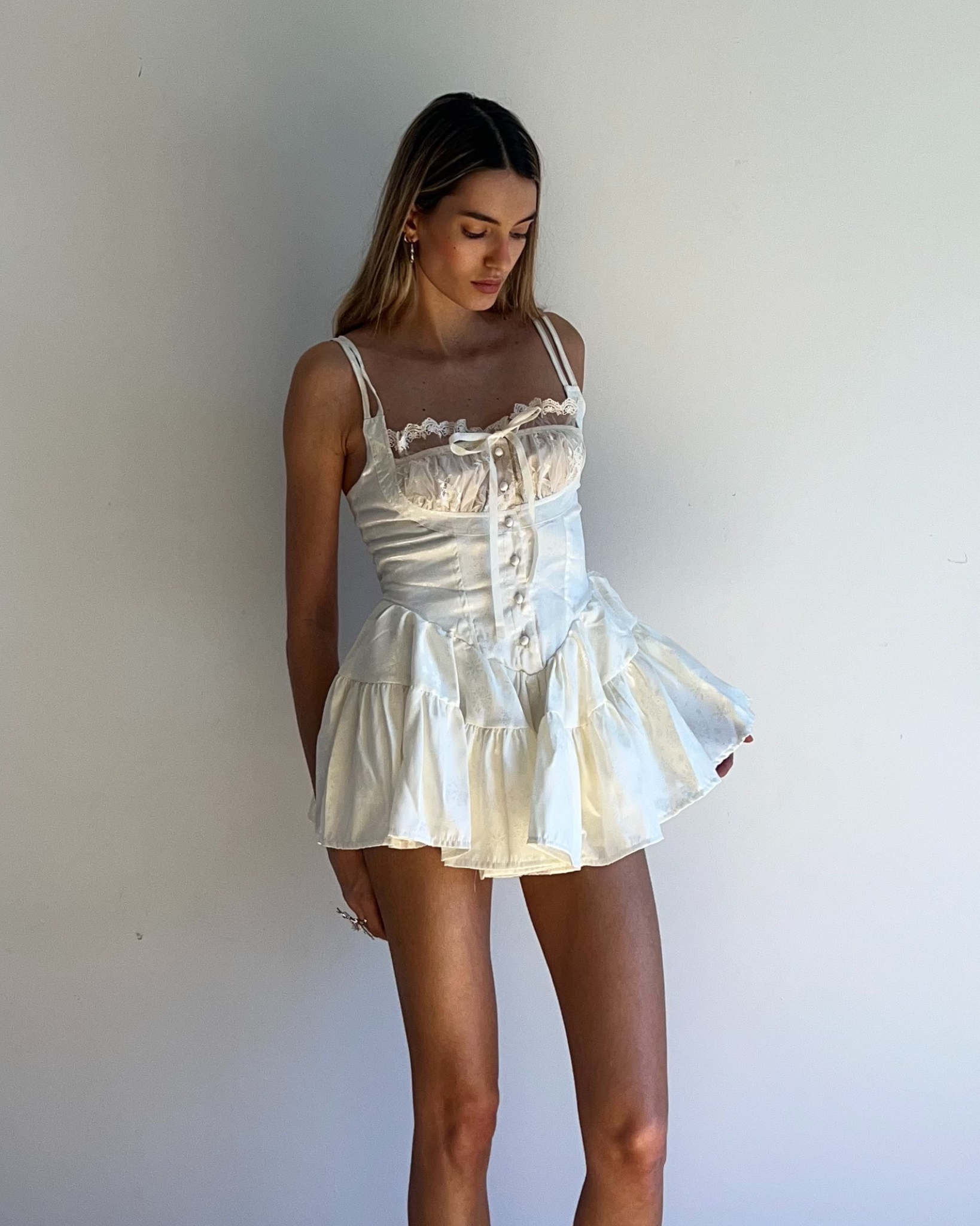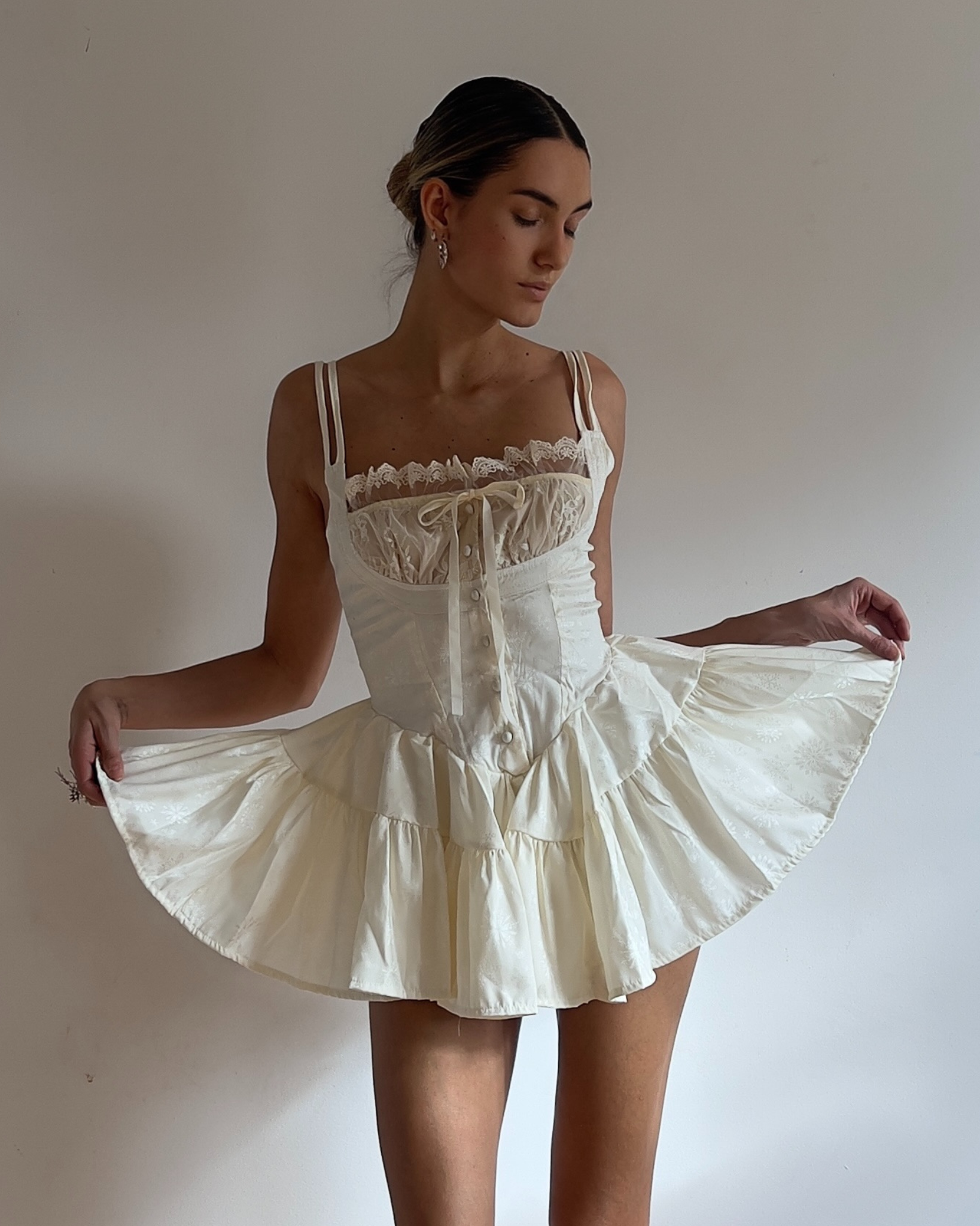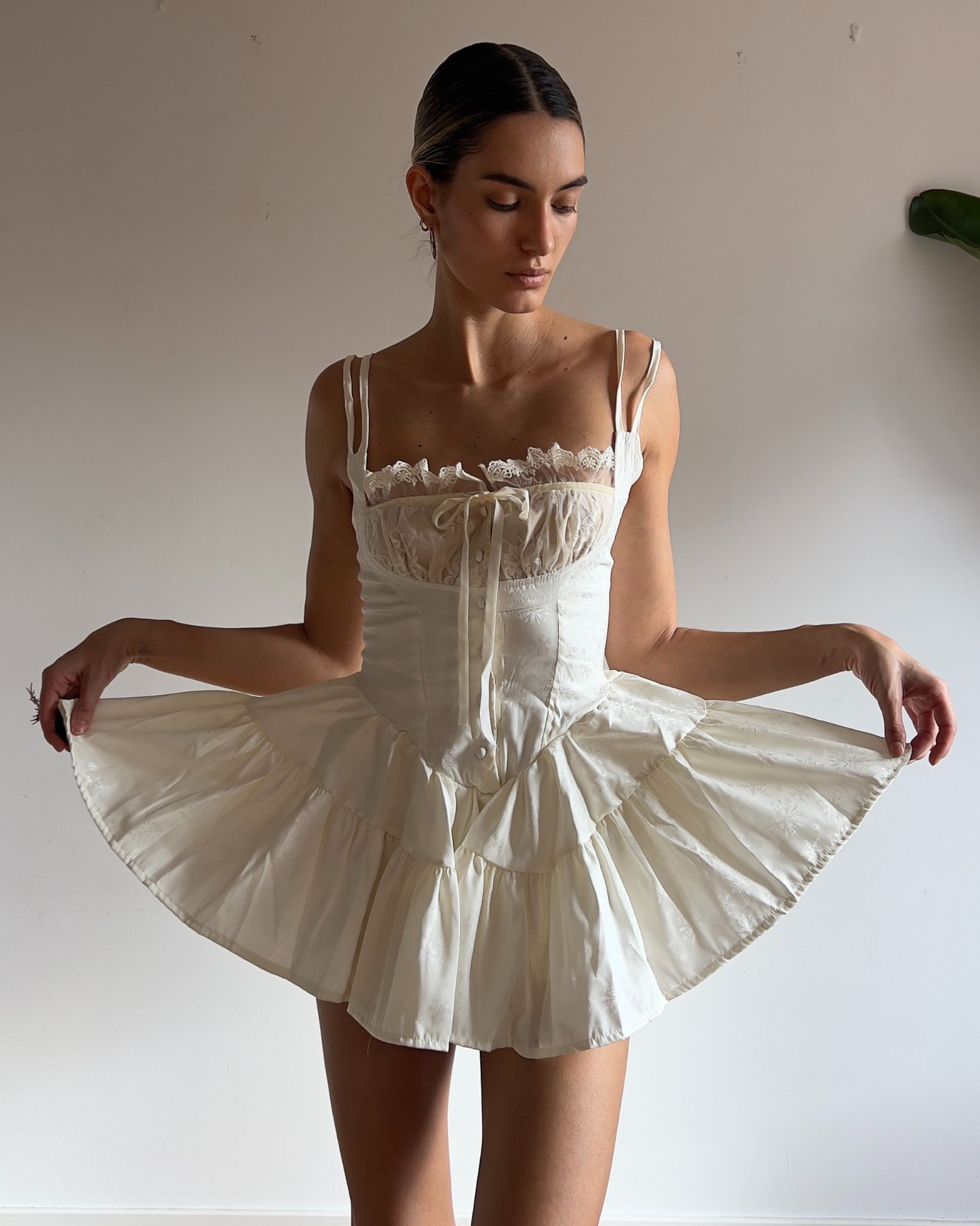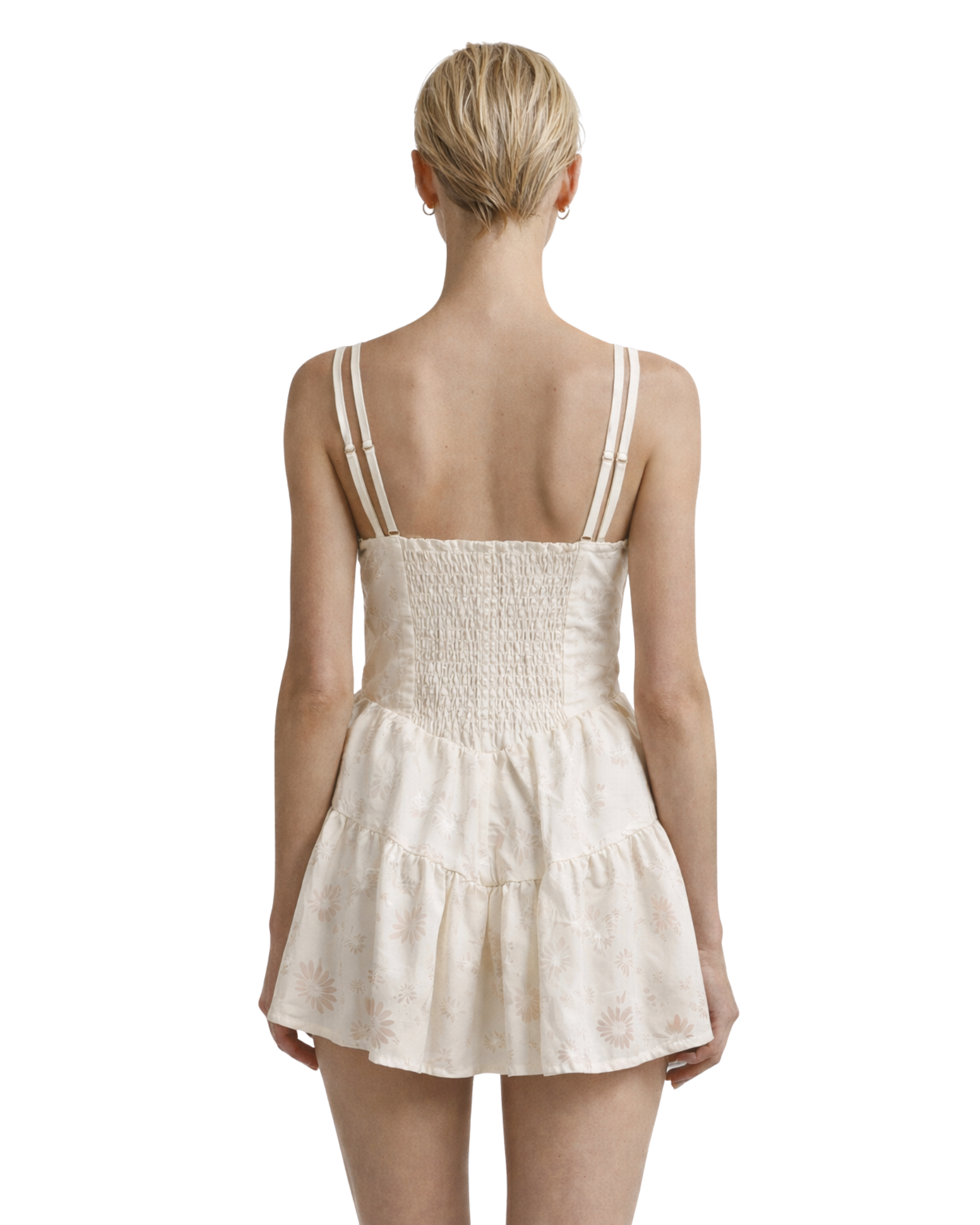 A mini dress with voluminous skirt and built-in shorts for ultimate comfort.