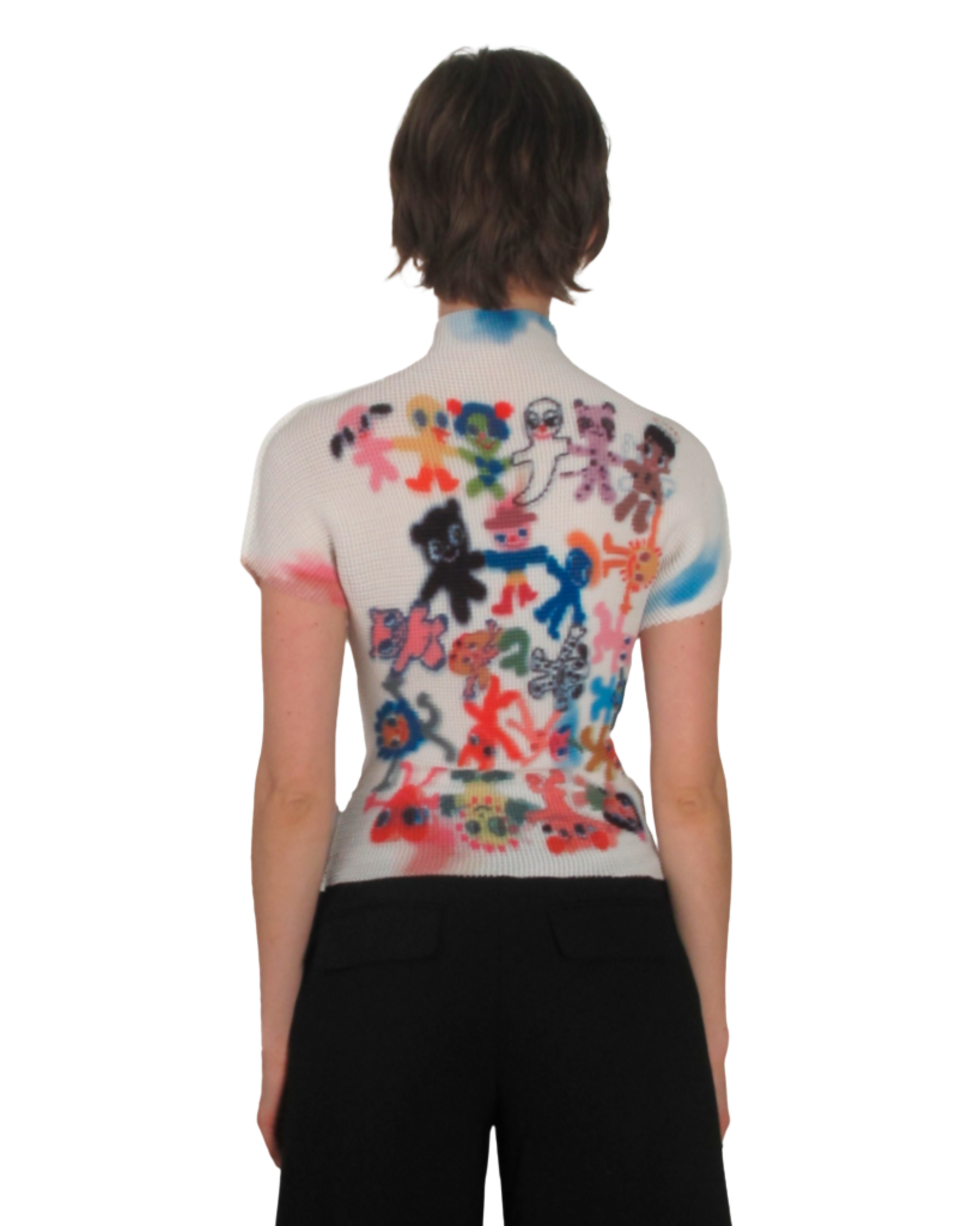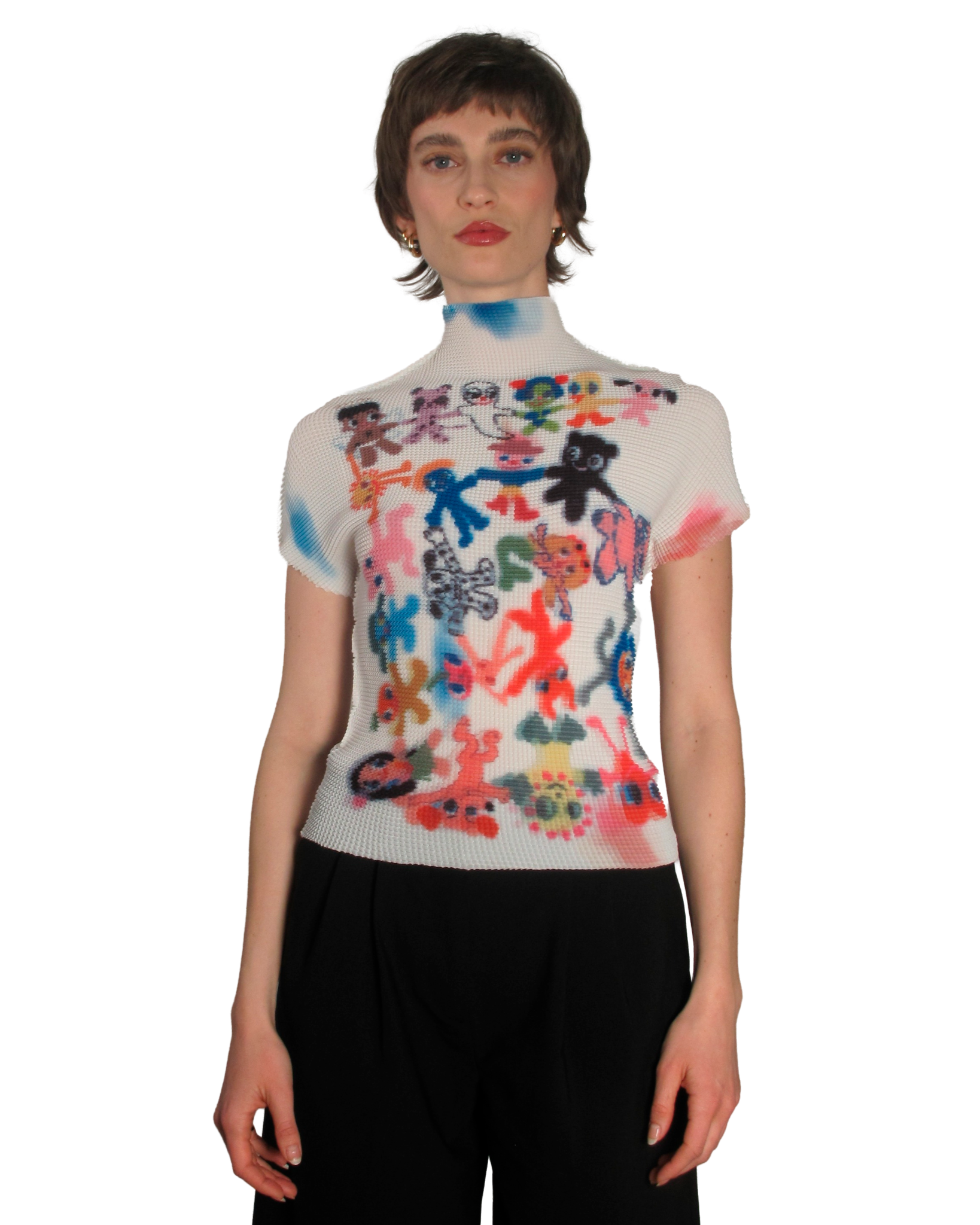 Introducing our one-of-a-kind top featuring a playful, whimsical design. Crafted from exceptionally soft and stretchable fabric that adjusts perfectly to your body. No matter how much you stretch it, the vibrant drawings retain their shape, making it a fun and durable addition to your wardrobe.