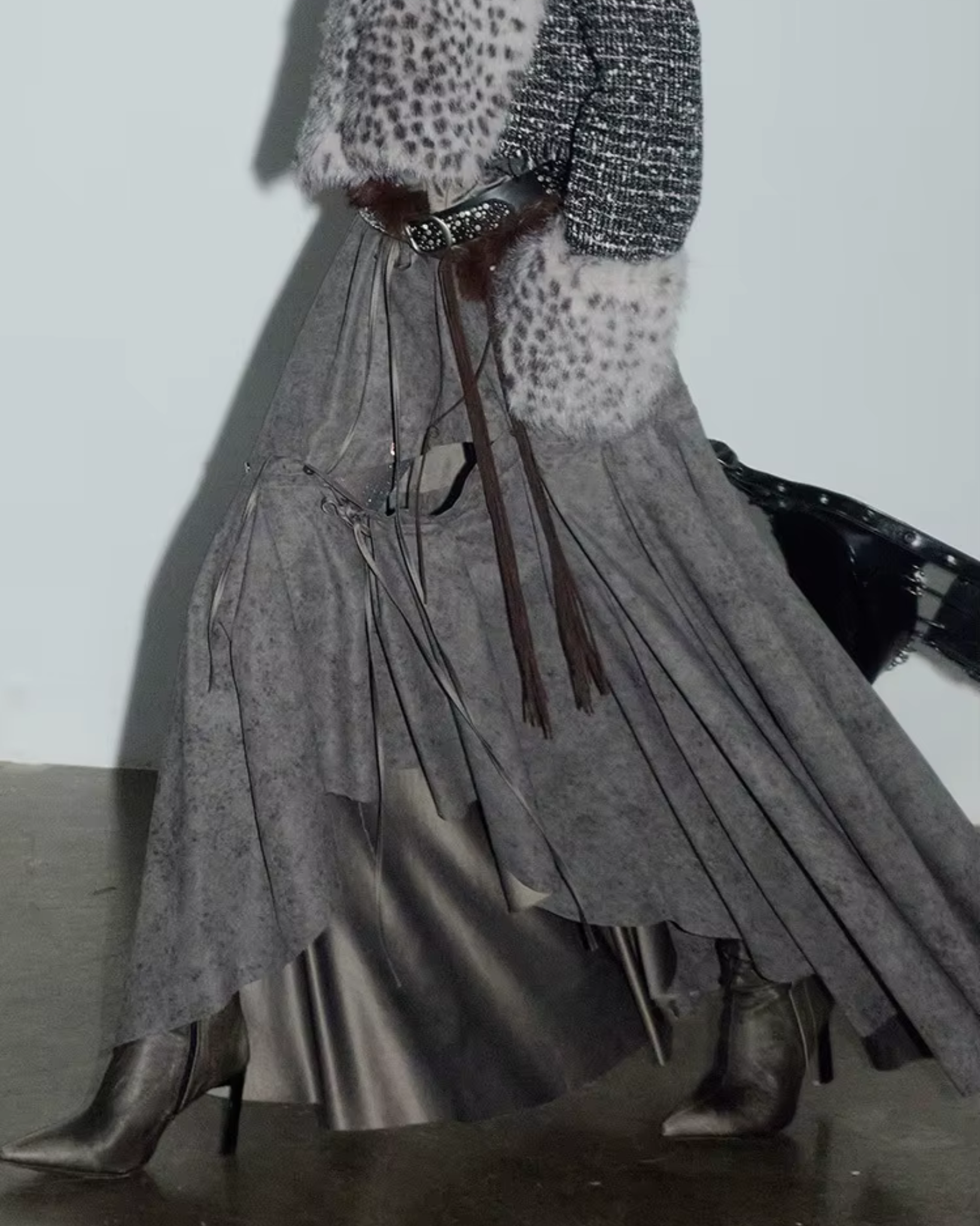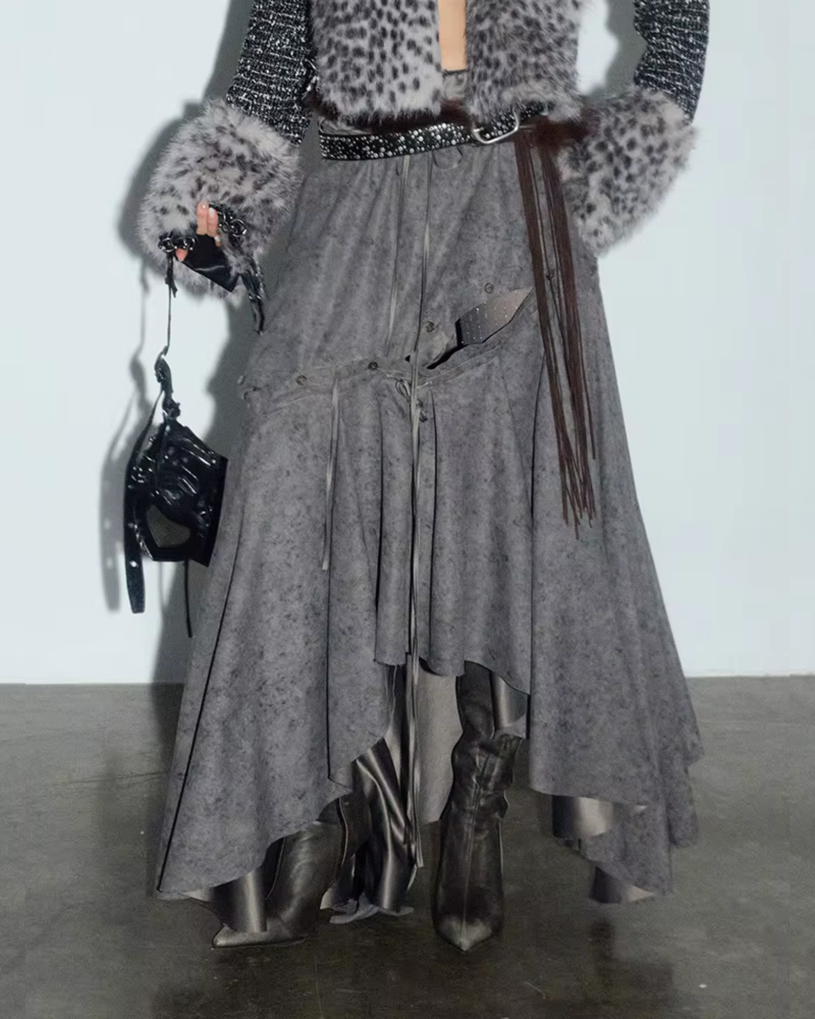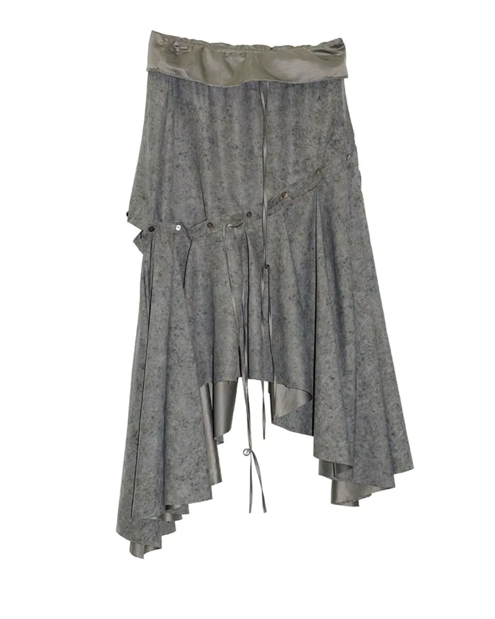 This irregular skirt is designed with an asymmetric cut and layered panels, it creates a fluid silhouette that moves beautifully as you walk. It features a detachable panel, allowing you to change the look depending on how you style it.