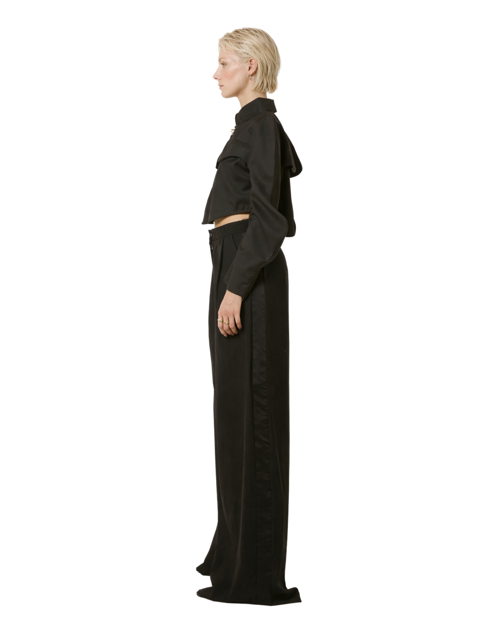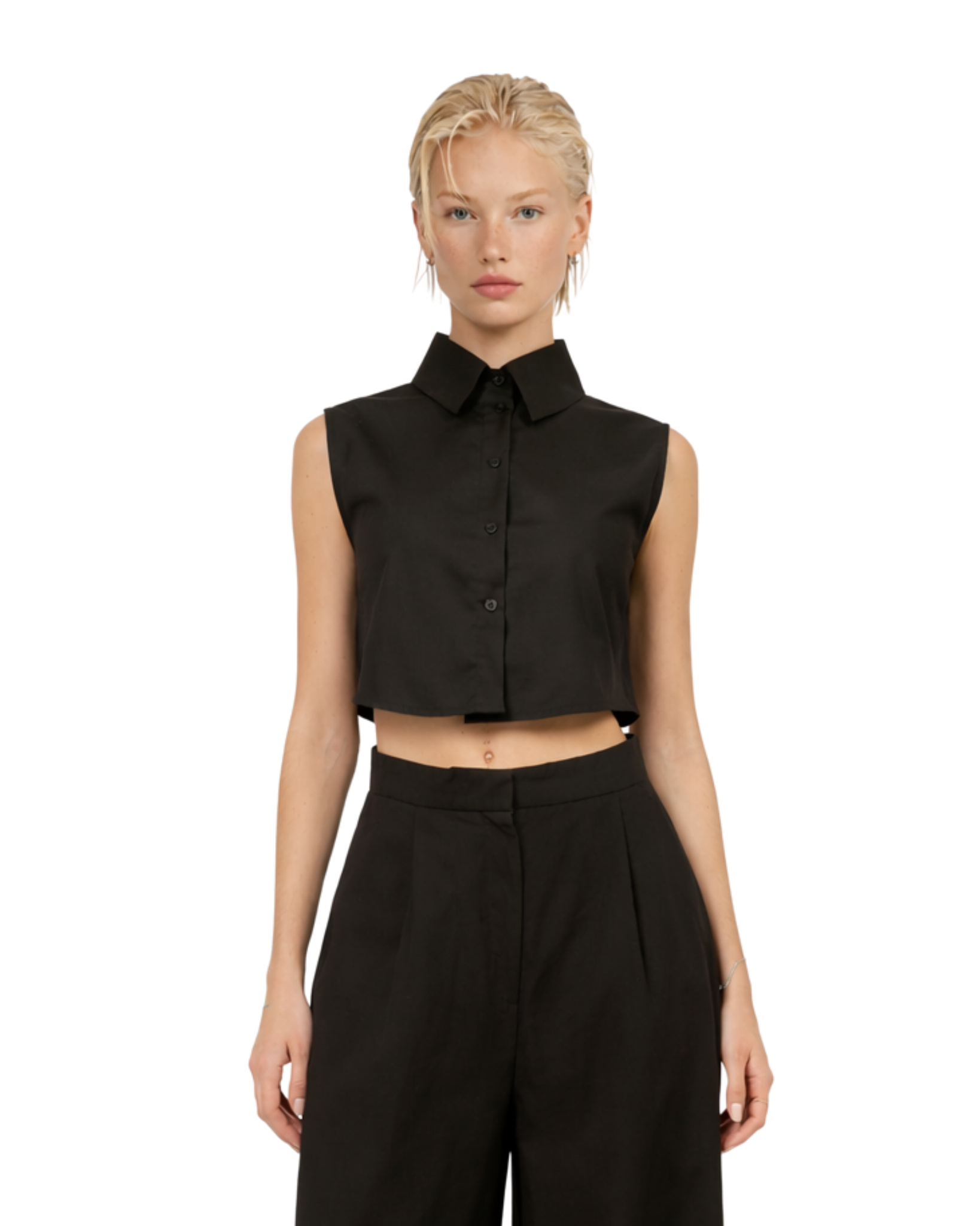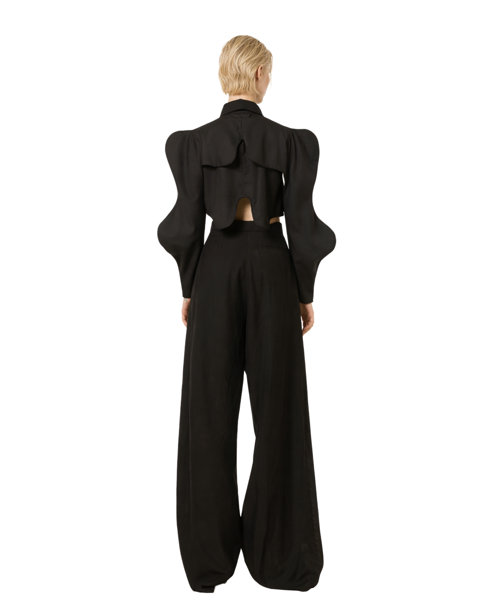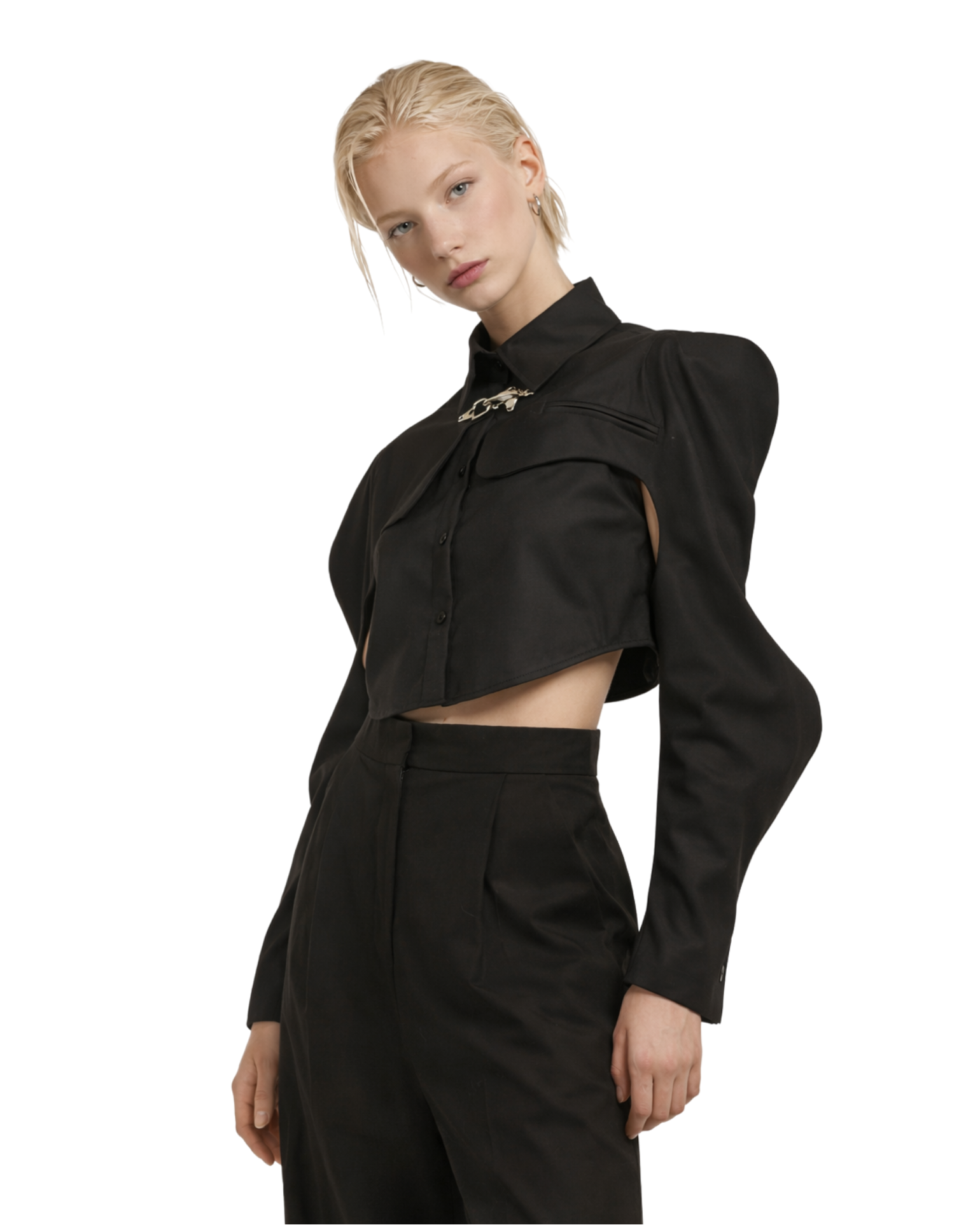 This top features a classic shirt neck and separated sleeves that give the top a modern and contemporary feel, making it perfect for those who want to make a statement with their fashion choices. The sleeves have a wave design and a metal embellishment that can be opened and closed, adding an interesting and unexpected element. The top is made of high-quality materials that ensure it will last for years to come.