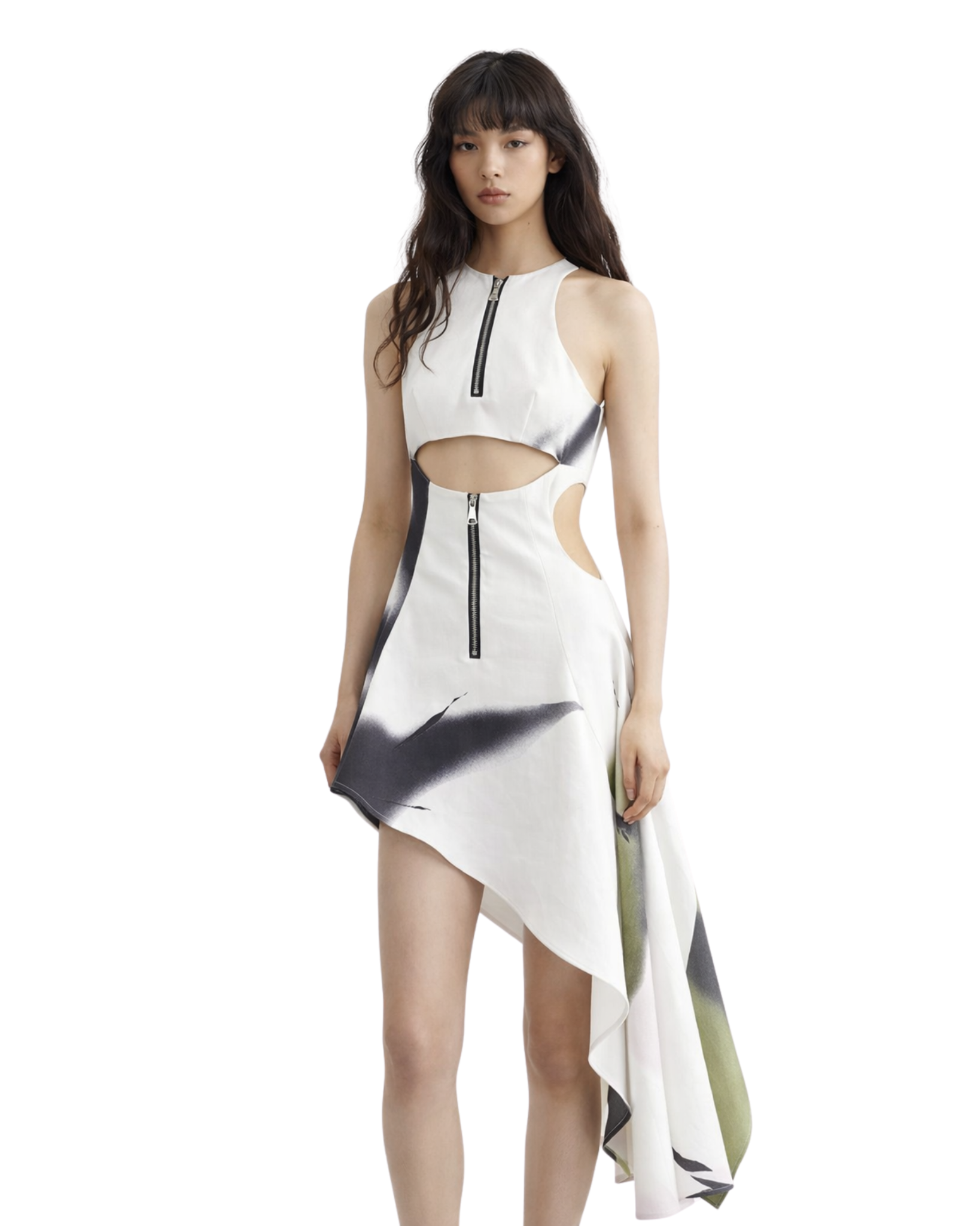 The dress is designed with a modern twist, featuring a zipper on both the chest and skirt for added convenience and style. The chest area also features a bold, statement-making hole that separates the top and skirt, adding a touch of edginess to the dress.